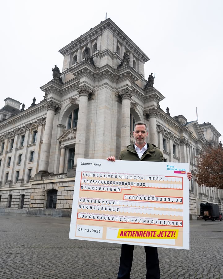 Wow - schon 1000 Unterstützer in weniger als 24 Stunden! Bei der Rente steuert die schwarz-rote Regierung völlig kopflos in ein Desaster. Wir brauchen jetzt einen Systemwechsel, um das Rentensystem nachhaltig zu stabilisieren. Zeit für die Aktienrente, damit zukünftig alle Beitragszahler - insbesondere auch Geringverdiener - eine verlässliche Altersvorsorge haben. Die Zeit drängt. Jetzt kommt es auf Dich an: Unterstütze unseren Aufruf! Setzen wir uns gemeinsam dafür ein, dass die Rente sicher und generationengerecht wird: fdp.de/rentenpaket-stoppen