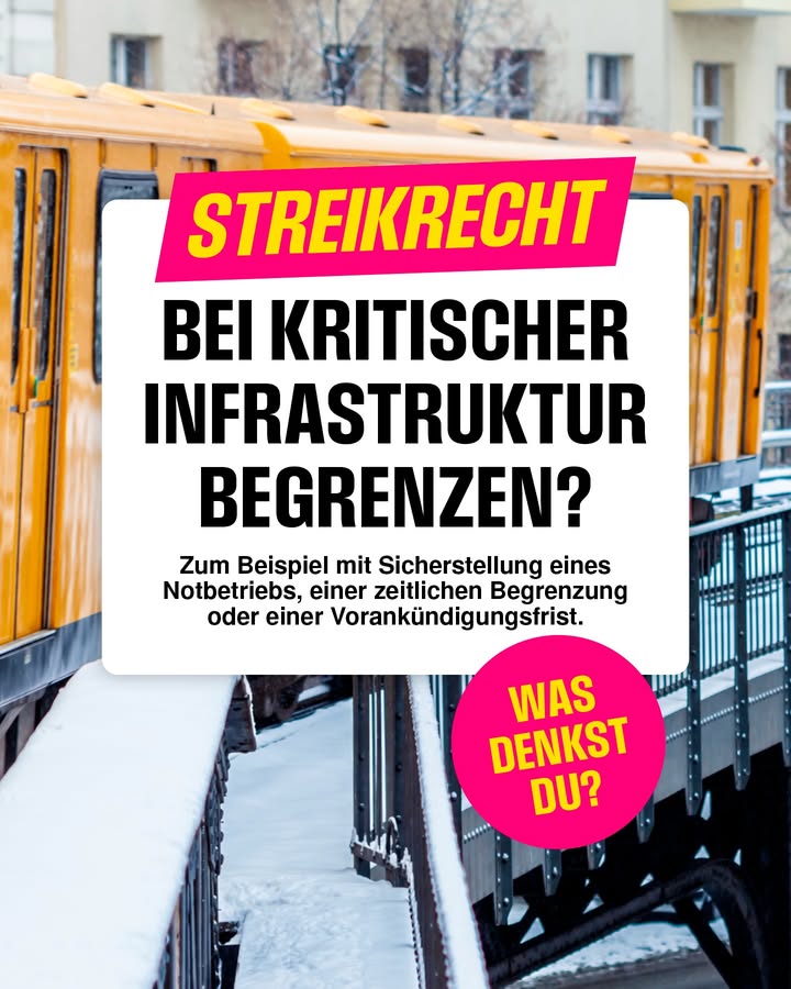 Insbesondere im Bereich der kritischen Infrastruktur beeinträchtigen Streiks unbeteiligte Dritte in erheblichem Maße. Das spüren die Menschen insbesondere beim ÖPNV regelmäßig. Wir sollten uns die Frage stellen, ob es nicht notwendig ist, den rechtlichen Rahmen in diesem sensiblen Bereich zu modernisieren. Möglichkeiten wären: ➡️ eine Mindestankündigungsfrist von 72 Stunden ➡️ eine zeitliche Begrenzung: Die Dauer von Warnstreiks darf 4 Stunden nicht überschreiten. ➡️ ein obligatorischer Notbetrieb, mit dem mindestens 50% des Betriebes aufrechterhalten bleiben Was meinst Du? Braucht es ein moderneres Streikrecht?